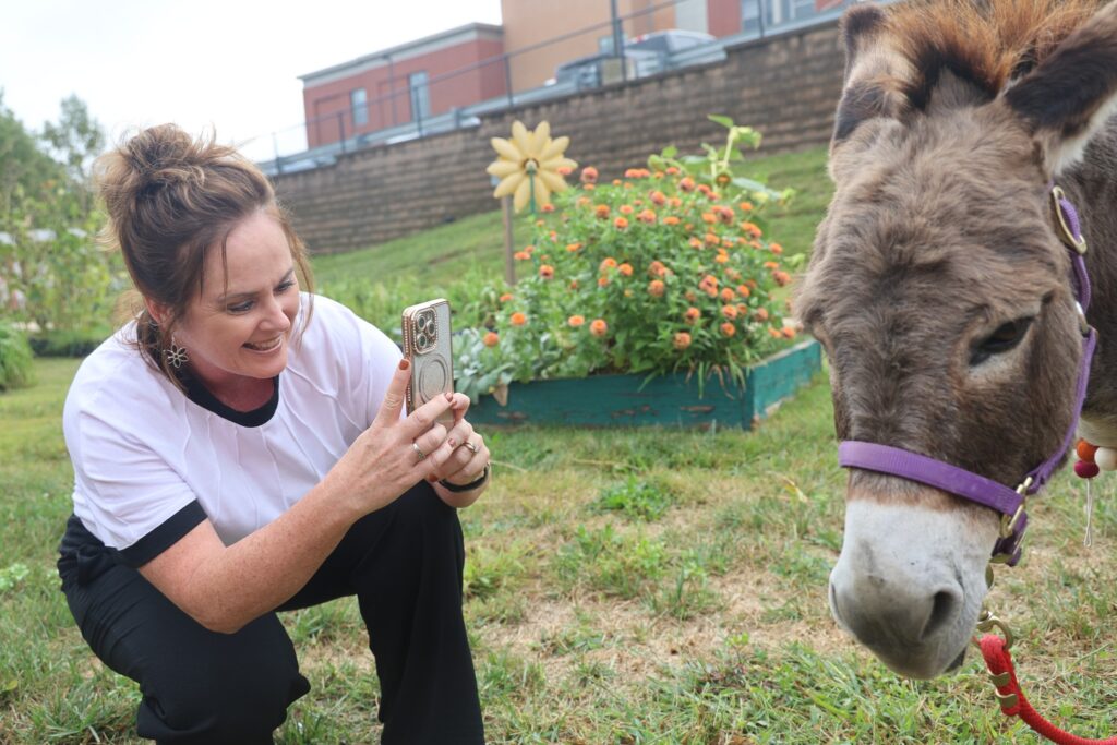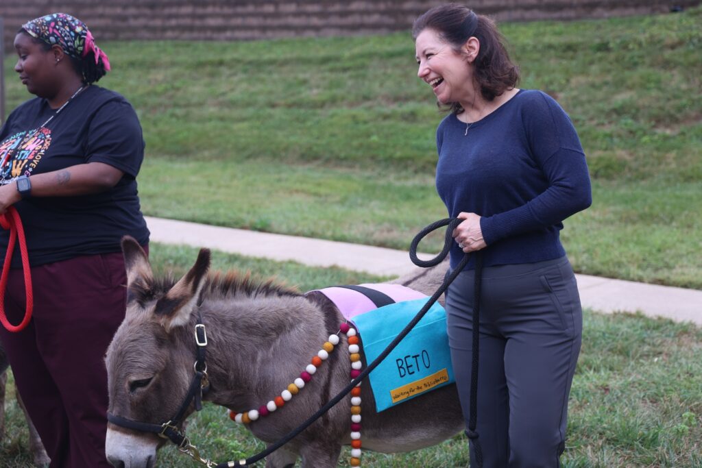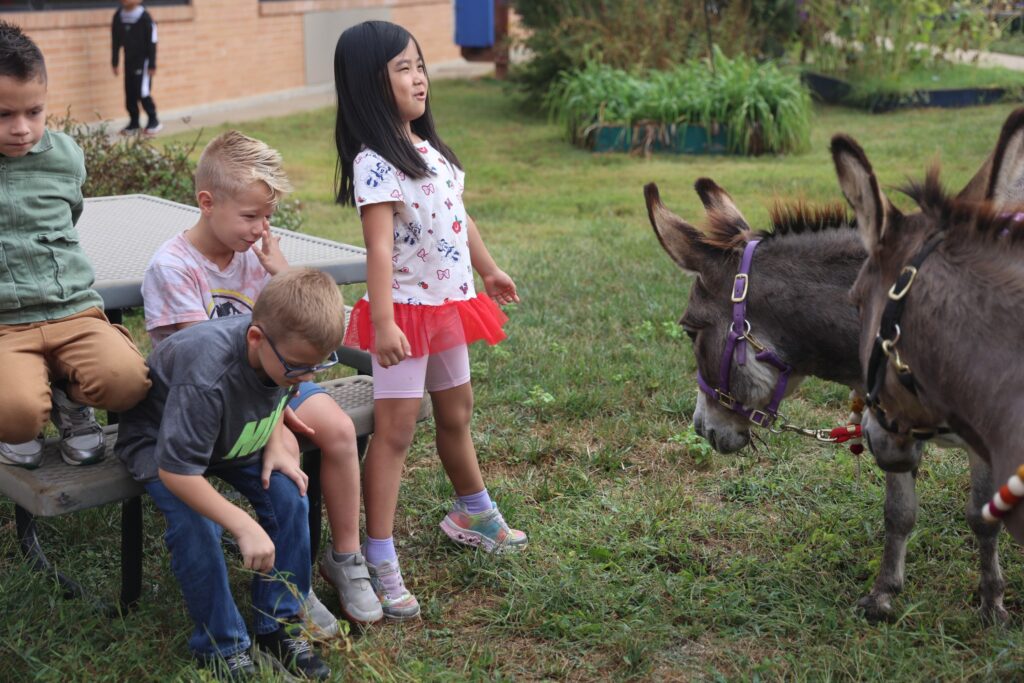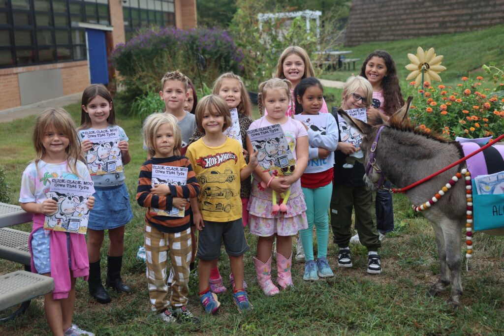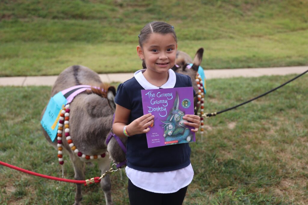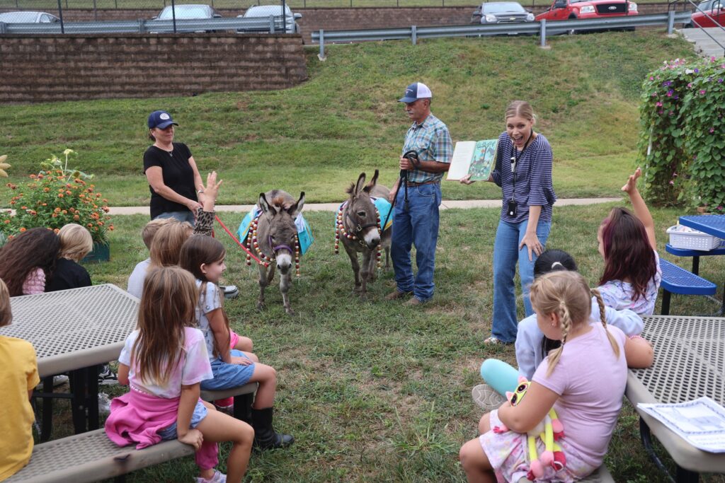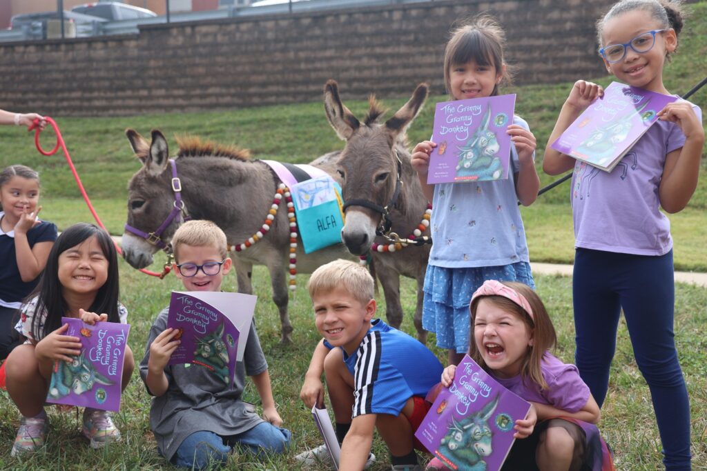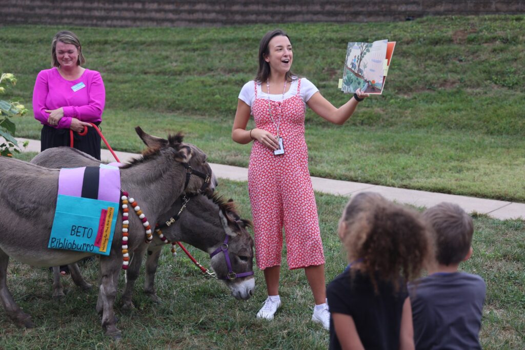 Jazz and Gidget presented to Blackhurst Elementary as "Alfa and Beto" two donkeys featured in "Waiting for the Biblioburro." The childrens book by Monica Brown tells how a young girl in Columbia eagerly awaits the arrival of the biblioburro to bring her and the other children of her village new books. The children and our Mini Donkey Companion Volunteer, Jerry Bliss enjoyed the story and companionship.